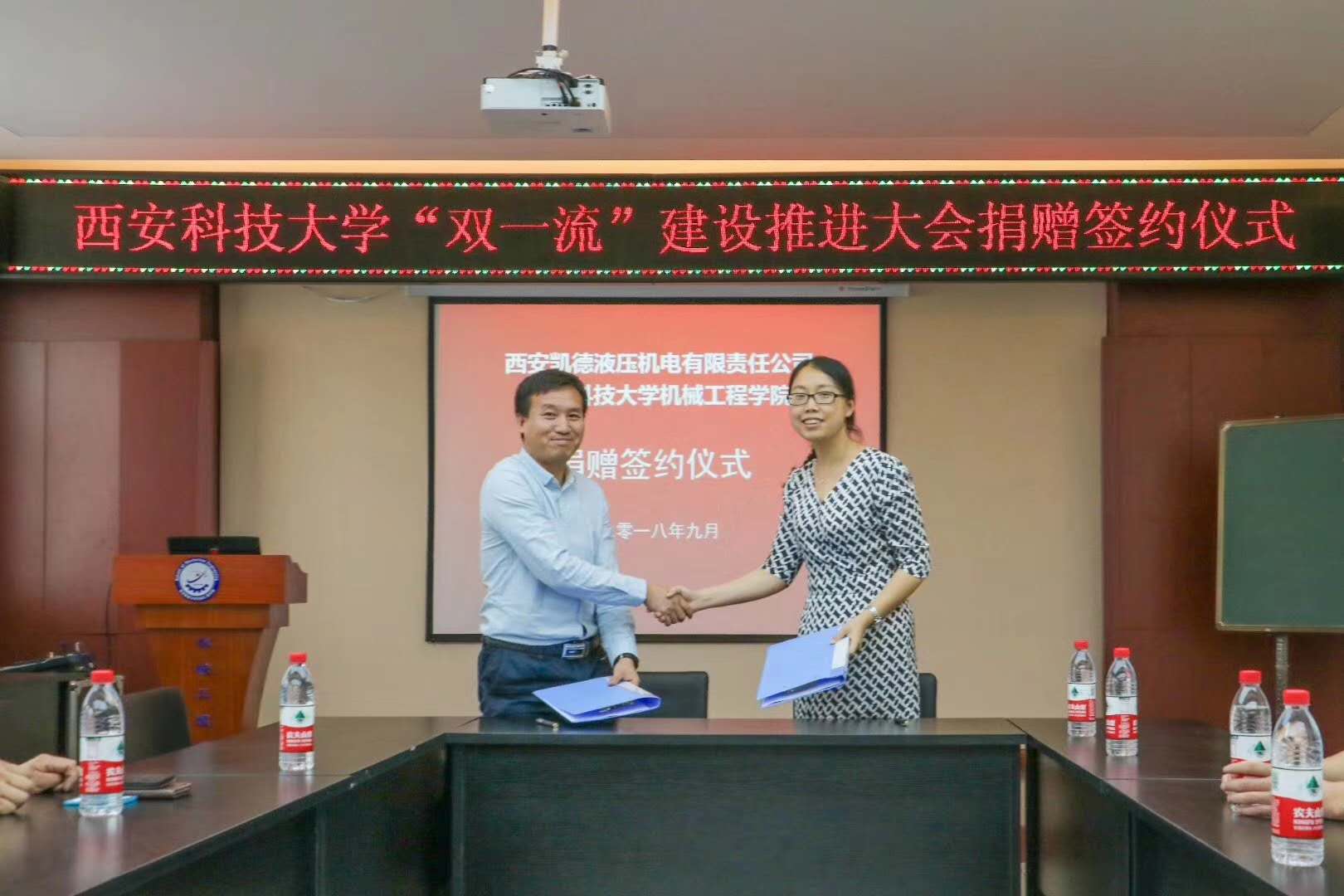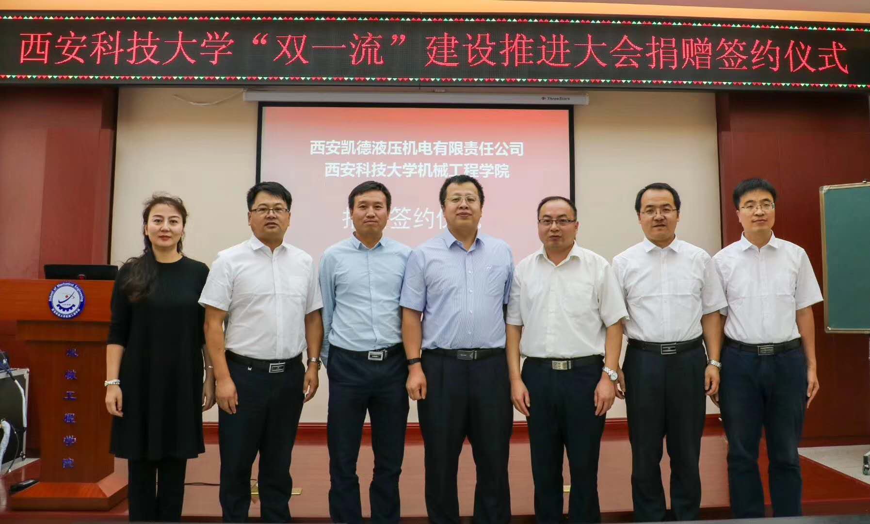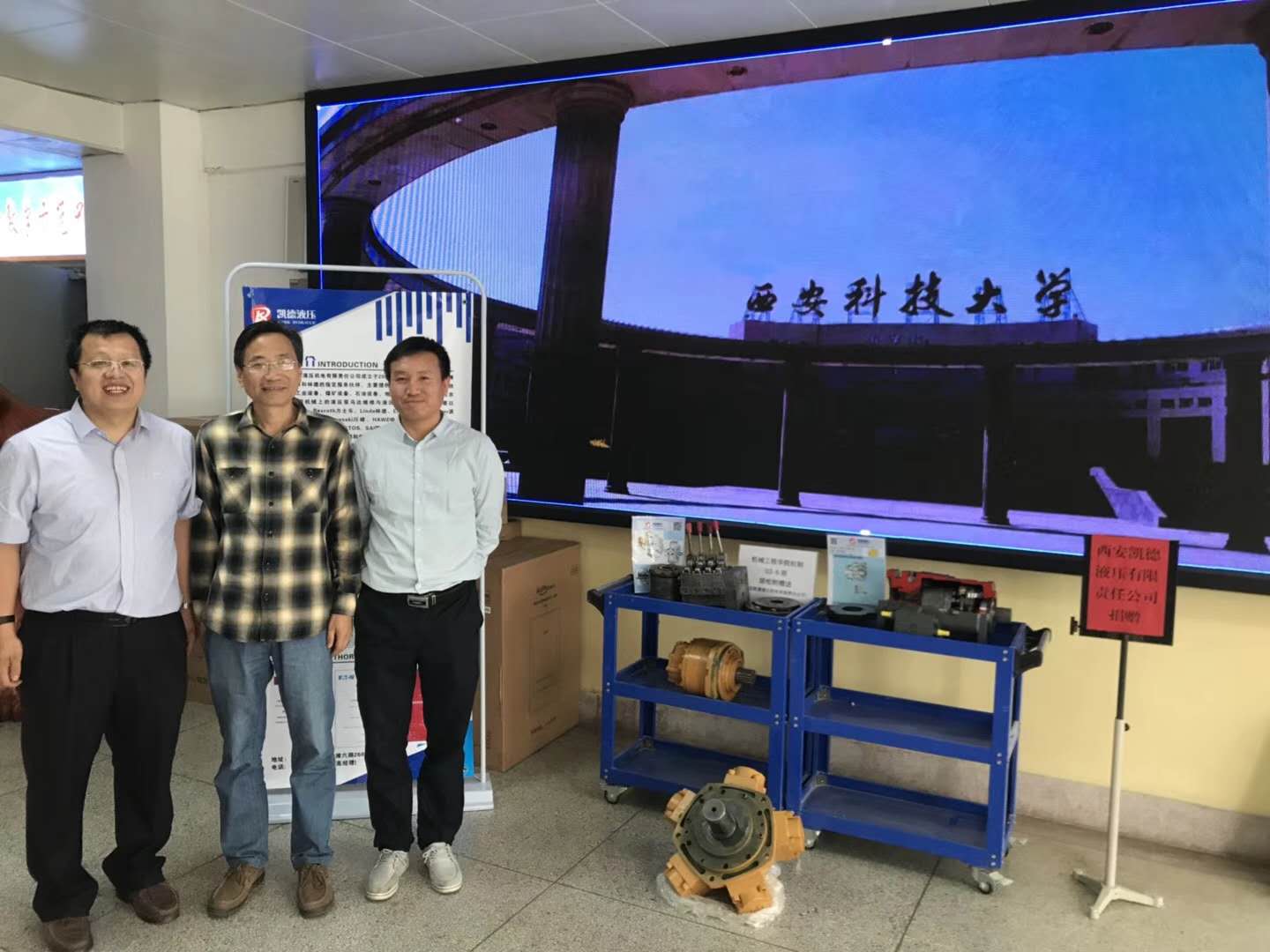 9月14日上午,為慶賀西安科技大學六十周年校慶,我公司總經(jīng)理高彥軍、技術(shù)總監(jiān)胡松剛一行代表西安凱德液壓來到西安科技大學臨潼校區(qū)驪山校園,向機械工程學院捐贈了液壓馬達、液壓泵等液壓元件解剖件。機械工程學院黨委書記汪衛(wèi)兵,院長張旭輝,黨委副書記李婉麗,副院長趙栓峰,副院長寇發(fā)榮等相關(guān)負責人及部分學生參加了簽約儀式。